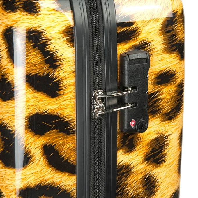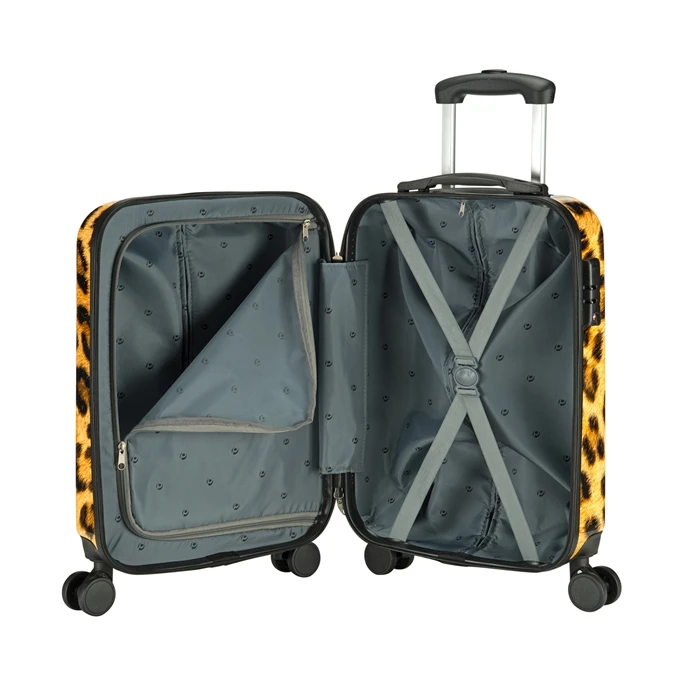 Deze harde koffer met luipaard print van Princess Traveller is geschikt om als handbagage mee te nemen in het vliegtuig. Met een handbagage koffer ten opzichte van een ruimbagage koffer bespaar je tijd en geld. Je hoeft je ruimbagage niet in te checken op de luchthaven en bij aankomst op je bestemming hoef je niet te wachten bij de bagageband om je koffer op te halen. Daarnaast moet je voor ruimbagage ook vaak extra betalen. Als het even kan adviseren wij daarom om een handbagage koffer mee te nemen. Deze Princess Traveller harde koffer is gemaakt van ABS. De koffer heeft een buitenafmeting van H 55 x B 35 x D 20 cm en heeft een inhoud van 26 liter. Omdat deze Princess Traveller koffer voorzien is van 4 wielen, is de koffer wendbaar en stabiel. Ten opzichte van koffers met 2 wielen is het minder zwaar om de koffer te vervoeren, omdat deze rechtop kan blijven staan. Deze Princess Traveller koffer heeft een inhoud van 26 liter. Dit is voldoende ruimte voor een reis van 2-3 dagen.